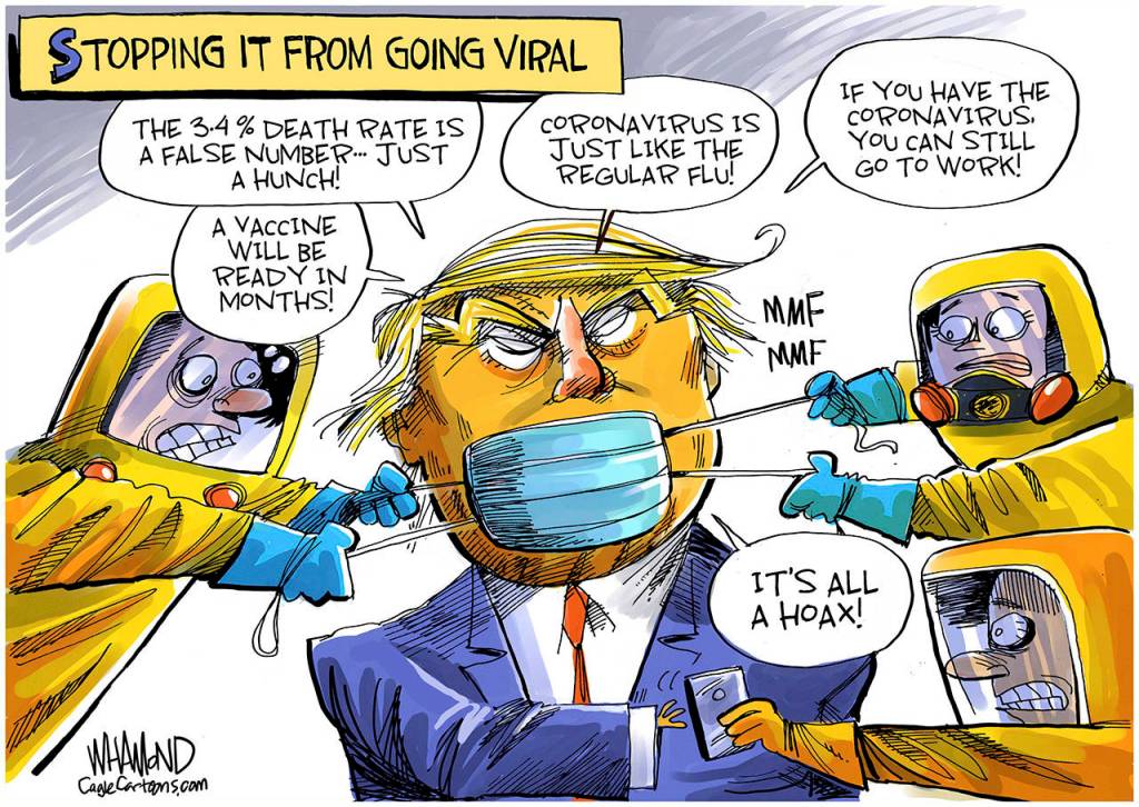 In February, once he kept repeating that only one person from China got the virus, he moved on to the next stage: denial. The whole month, he kept saying that “one day, it’s like a miracle, it will just disappear.” Man, and I thought this man’s brain couldn’t get any smaller!